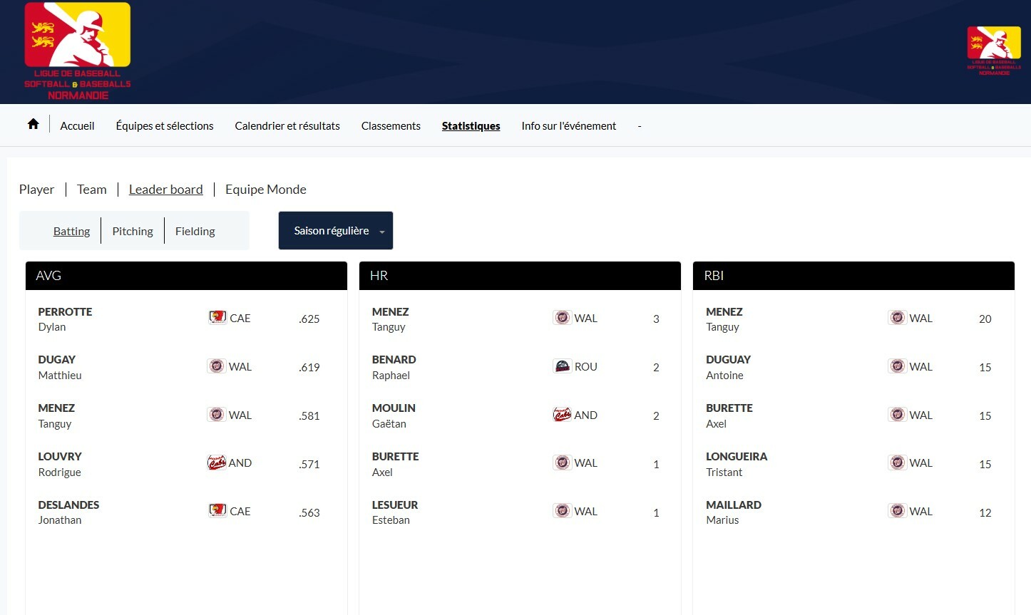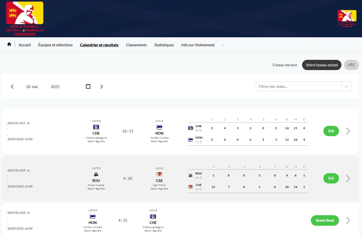 Les résultats, les classements et les statistiques sont ensuite automatiquement mis à jour et disponibles sur la page de notre championnat sur le site fédéral : Championnat R1 baseball ligue normandie
